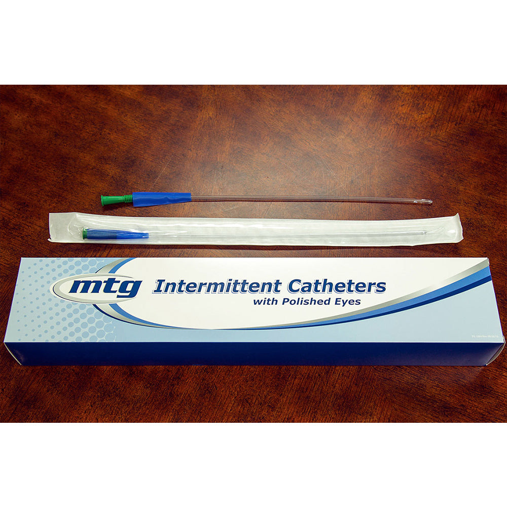 Blue “no touch” handling sleeve allows the catheter to be inserted without touching of the tube, reducing surface contamination and possible risk of infection. Click to see video showing how to use this catheter Smooth, fire polished eyelets (drainage holes) allow for comfortable passage through the urethra and into the bladder. Offset eyes, located near the tip of the catheter provide drainage from two points within the bladder. MTG male catheters are available in 12, 14 and 16 French sizes. These catheters are 16” in length. Color-coded funnel indicates French size. Also available with soft vinyl tubing for users with sensation issues. DEHP-free catheter tube