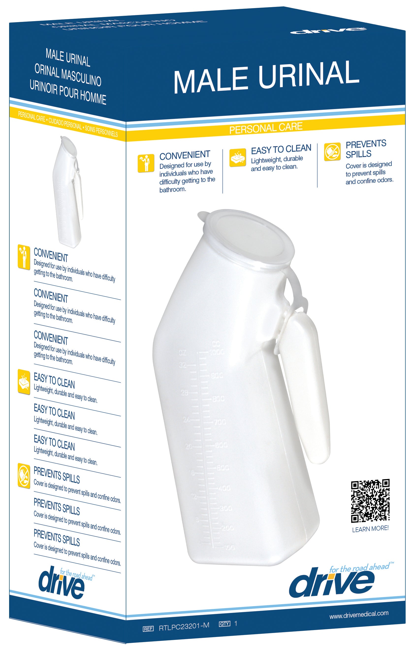 The Drive Medical Male Urinal is an essential personal care accessory for anyone who has trouble getting out of bed. Lightweight, durable and easy to clean, the urinal is designed to prevent spills and features a sturdy grip for easy handling and can be used in several positions by the patient. The cap helps to confine odors, and there are graduation marks on the product to measure output. Holds 32 ounces. Backed by Drive Medical, a leading manufacturer of medical equipment and personal care products for more than 30 years, you can purchase with confidence.