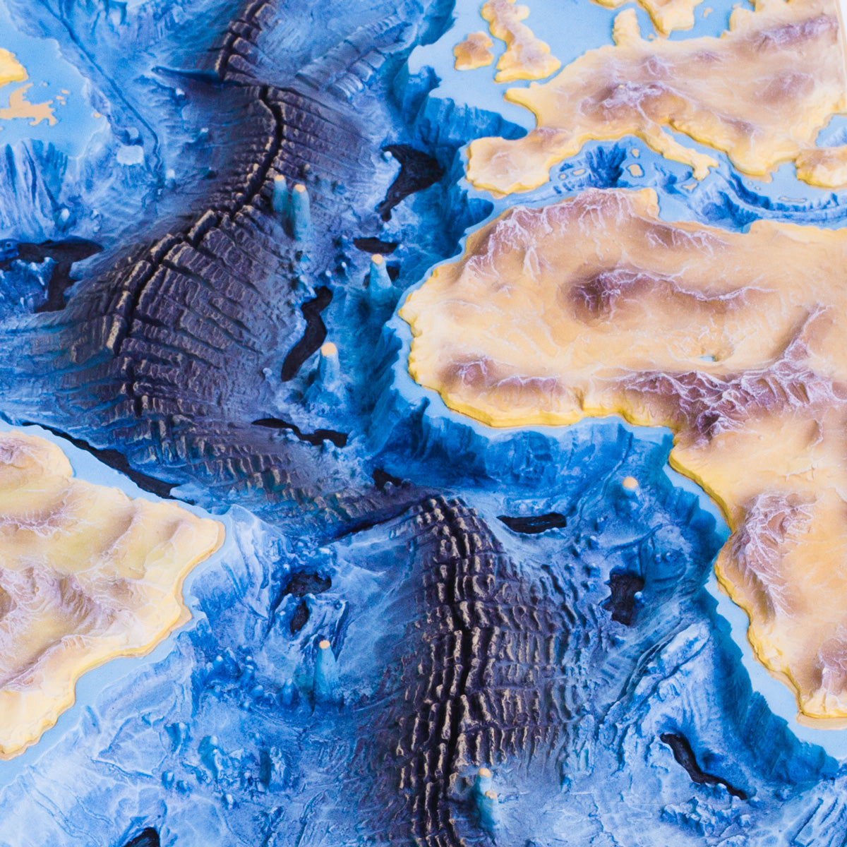 This model of the Mid-Atlantic ridge shows the S-shaped course in 3D of the volcanic mountain range produced by tectonic shifts in the Atlantic Ocean.