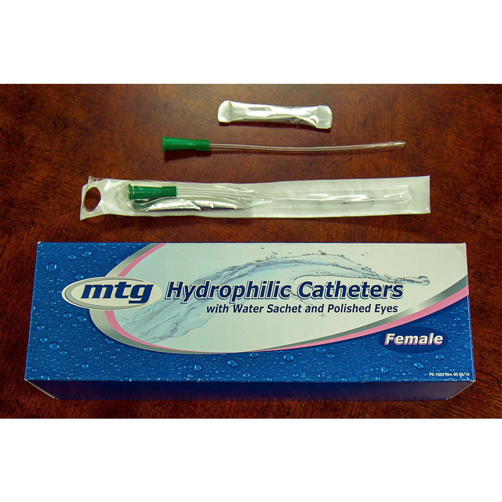 Slippery hydrophilic lubrication makes catheter insertion much easier with low friction. Saves time — just bend and burst the sterile water sachet to begin lubricating the catheter. Invisible, sheer lubricant is less messy than gels. Each catheter outer package includes an adhesive tab. During activation, the package can be affixed to a sink or wall. Smooth, fire polished eyelets (drainage holes) allow for comfortable passage through the urethra and into the bladder. Offset eyes, located near the tip of the catheter provide drainage from two points within the bladder. This female catheter is available in 12 and 14 French sizes. DEHP-free catheter tube