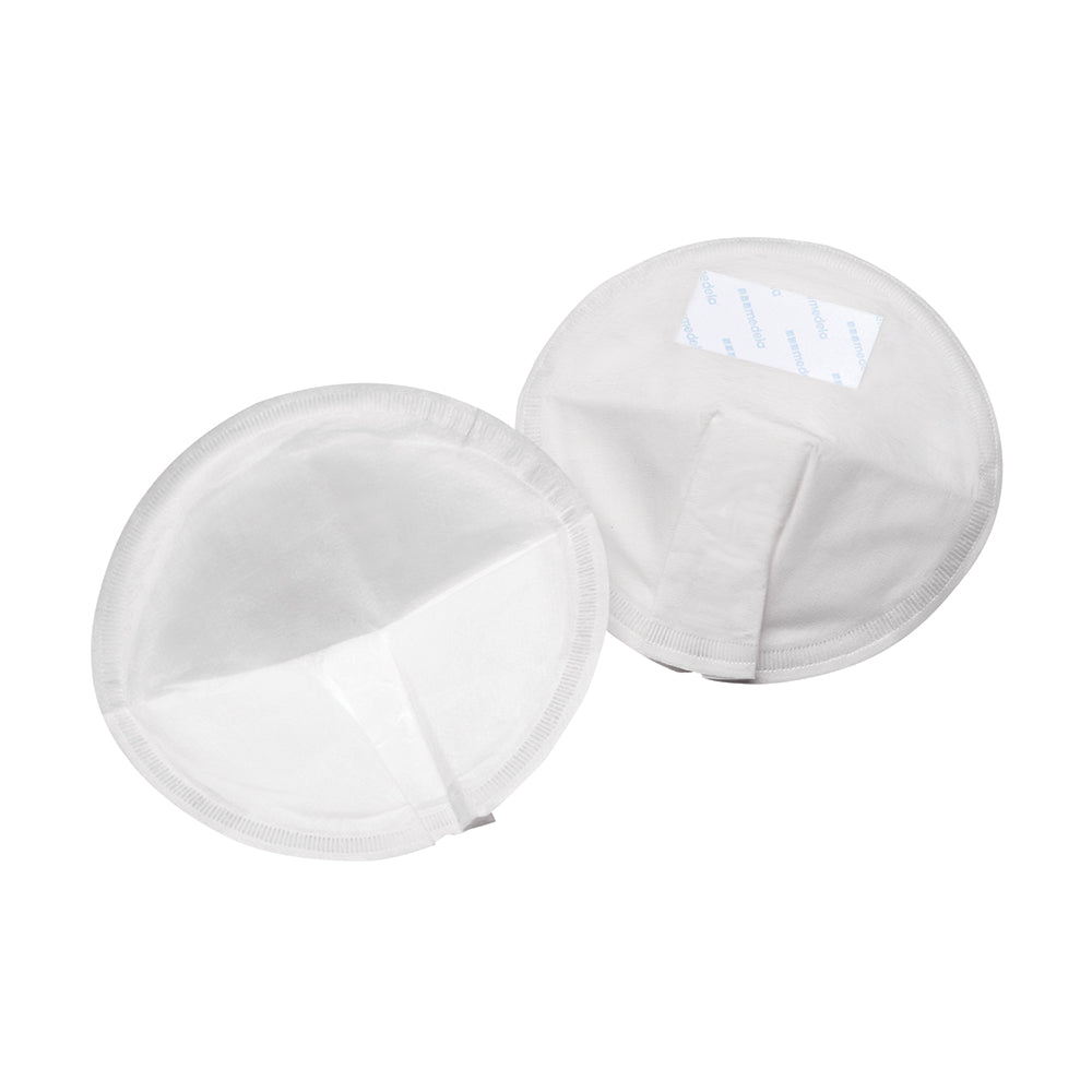 Soft cotton-lined pads are worn against nipples to collect breastmilk leaks. Double-sided adhesive back sticks inside bra for secure hold. Absorbent and soft against skin. Keep clothing stain-free. Contoured pad shape for discreet fit. Use day or night. Disposable pads.