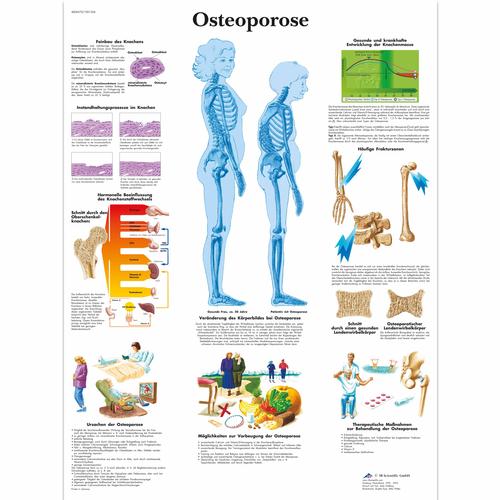 This colorful anatomical chart displays both the gross and microanatomy of bones effected by osteoporosis as well as the gross anatomy. The causes, prevention, and treatment of osteoporosis as well as other useful information are included on this anatomy poster. Printed on premium glossy (200g) paper. Convenient Poster size 50x67cm (20x26''). 19.7 x 26.4 in 978-3-82-940202-6