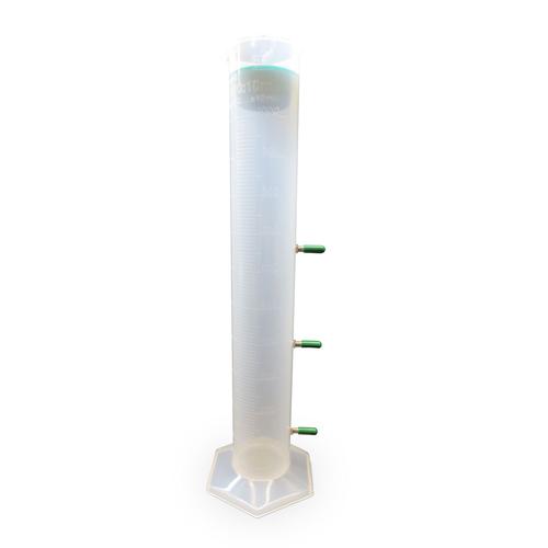 Plastic cylinder with three outlets positioned at different heights for investigating the dependence of hydrostatic pressure on water depth through an observation of the outlet water jets.