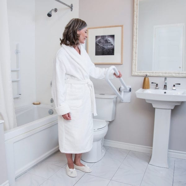 Unlike other bathroom safety rails, the PT Rail is designed with an innovative offset rail to avoid wrist strain when you’re sitting down or pulling yourself up from a seated position. The PT Rail is also easily stored; simply lift the rail until it is flush against your bathroom walls.