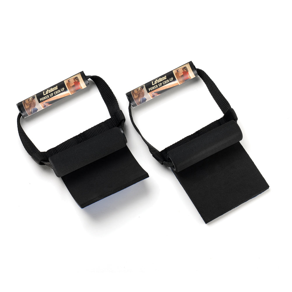 Classic pull-up and chin-up exercises anywhere. Attaches to any 3-hinge door. Effective to sculpt and define biceps and back. Comes with 2 power up chin-up units with foam grips and 2 wrist cushions. Instruction manual by fitness expert Jon Hinds.