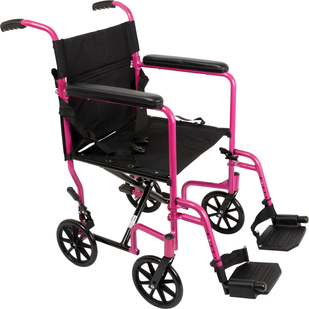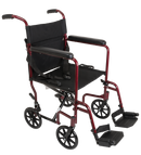 The ProBasics Aluminum Transport Chair is a compact, lightweight design with an easy-to-maintain finish. The flared handles and handy back-release hinge allow the back to fold down flat and compact for easy storage and transport. Stylish aluminum frame with permanent rear axel for strength and durability Padded full-length permanent armrests Padded nylon upholstery is comfortable, lightweight, and easy to clean Comes complete with seat belt for added safety, tool-free swing-away composite footrests and heel loops Nylon seat straps allow for ease of folding and lifting Push-to-lock rear wheel locks keep transport chair in place Composite 8" wheels with solid rubber tires are lightweight and maintenance free Seat dimensions: 19" x 16" Weight capacity: 300 lbs Black finish HCPCS* code: E1038* For a comfortable and durable transport option, purchase the ProBasics 19" Aluminum Transport Chair.