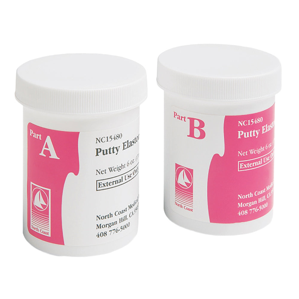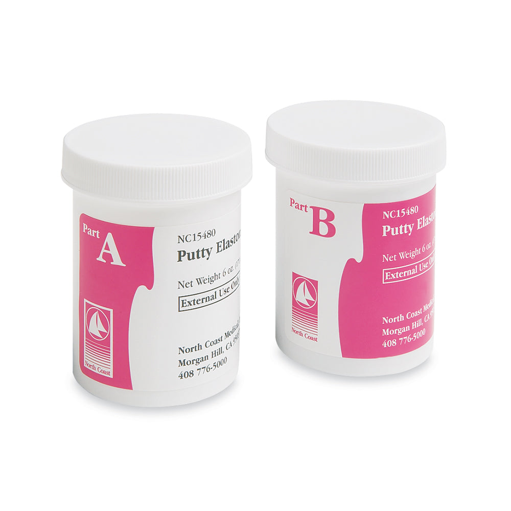 Easy to use, just mix in your hand!Putty-like elastomer is ideal for softening and flattening hypertrophic scarringFeatures a dense, firm consistencyUse Putty Elastomer™ when you need to control placement, such as in web spaces or other irregular areasGreat for building up handles or for finger separatorsJust place equal amounts of A and B in your hands and mixSets up at room temperature in approximately three minutesTwo 6 oz. jars of A and BMixing spoon is included