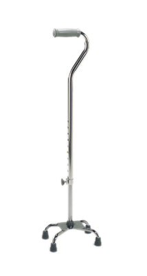 Quad cane with large has a 4 point base, combined with offset handle provides additional stability and support. Easy-to-use, one-button height adjustment with locking bolt, allows quick, safe fitting. No assembly required. Handle height adjusts from 30" - 39". 300 lb. Weight Capacity. Silver color.