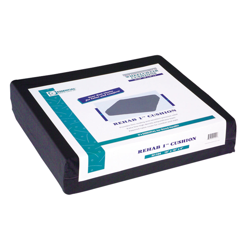 Basic rehab cushion made of high density polyurethane foam. Provides firm seating and pressure relief. Black zippered cotton cover. Sold by the each.