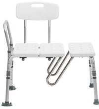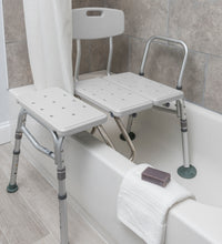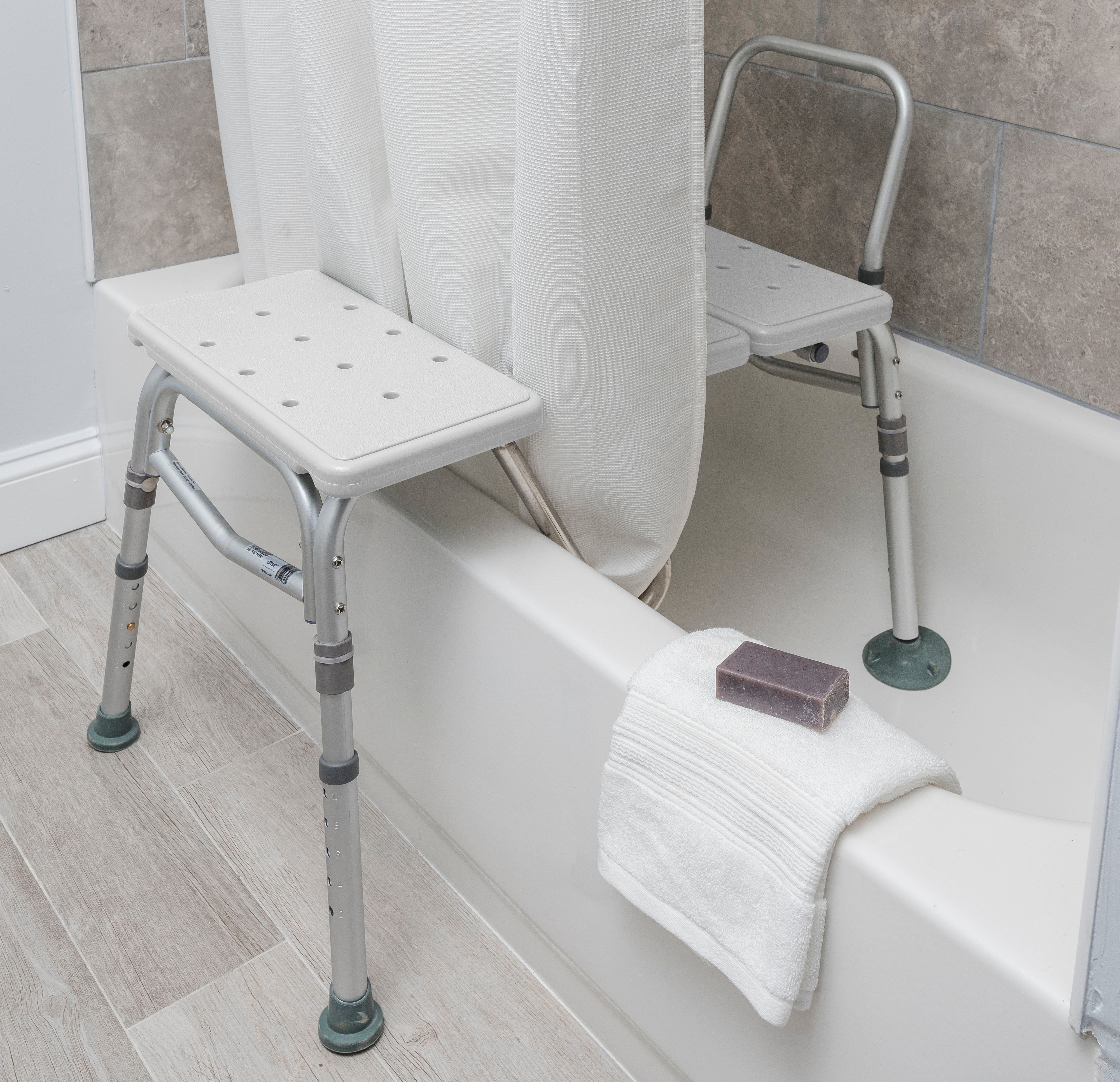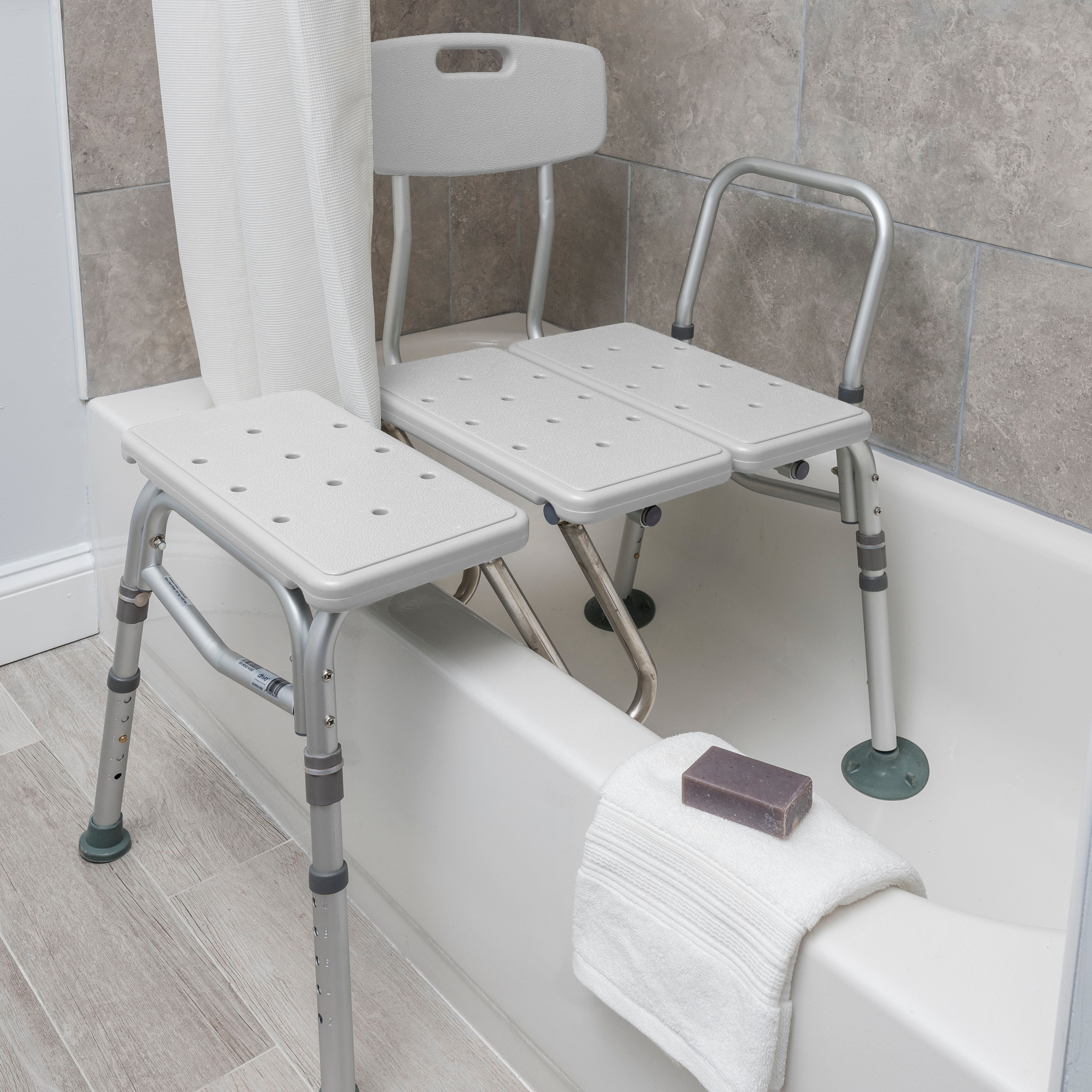 The Splash Defense Transfer Bench with Curtain Guard Protection makes it easier to get in and out of the tub and helps keep floors dry. The bath bench's innovative Curtain Guard Protection system prevents water from splashing onto the floor by providing a U-shaped cutout that the shower curtain liner passes through while remaining in the tub. Built to support up to 400 pounds, the bath transfer bench offers sturdy, reliable performance and features non-slip feet for stability. Its reversible design and adjustable legs accommodate almost any bathroom, and the tool-free assembly allows for quick and easy setup. Made from durable, blow-molded plastic, this lightweight bench is easy to clean and designed for both safety and convenience.
