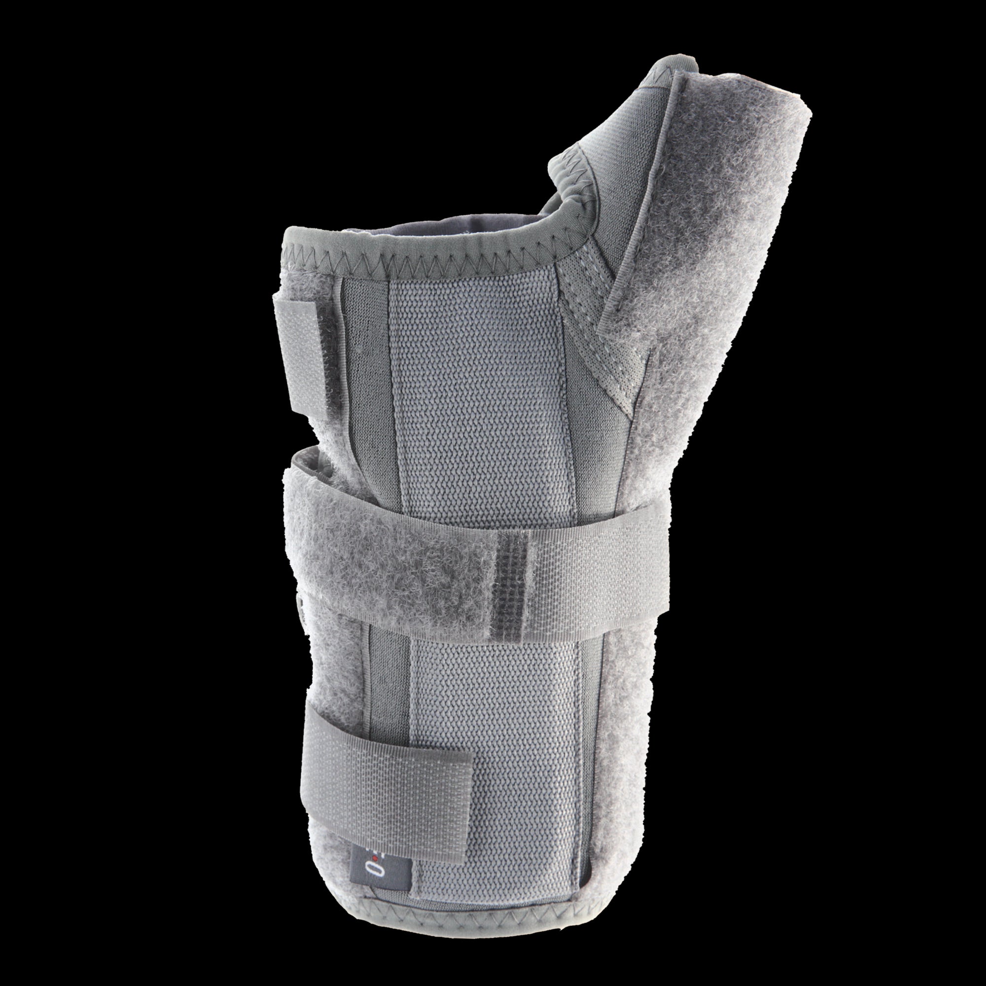 This product has a removable 6" palmar support and a removable 7" contoured aluminum thumb splint to help restrict wrist and thumb motions that may aggravate nerves, tendons, or ligaments. The adjustable thumb closure ensures desired thumb positioning and the adjustable wrist closures provide a custom fit. This product contours to the natural shape of the wrist and thumb for increased comfort and support. Specify left or right hand when ordering.