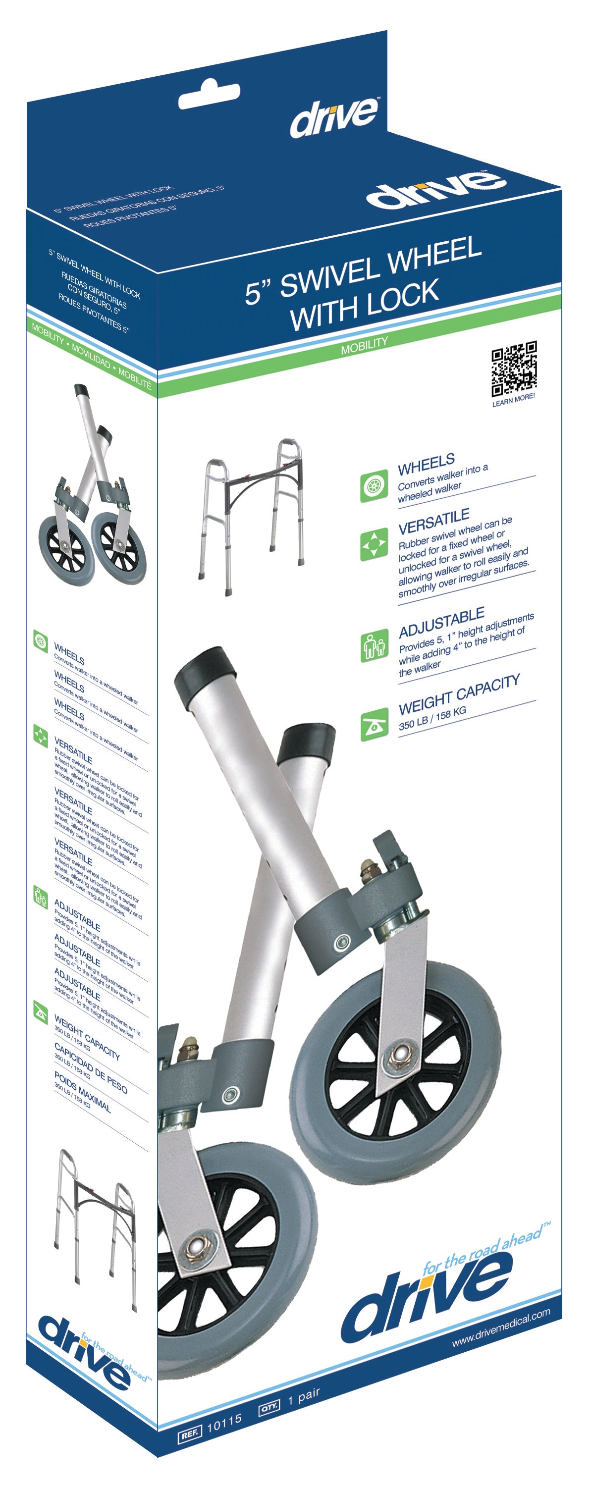 The Drive Medical Swivel Wheel with Lock and Two Sets of Rear Glides can be locked for fixed wheels or unlocked for swivel wheels. The 5" casters with rubber wheels and two rear glide caps, allow walkers to roll easily and smoothly over irregular surfaces.