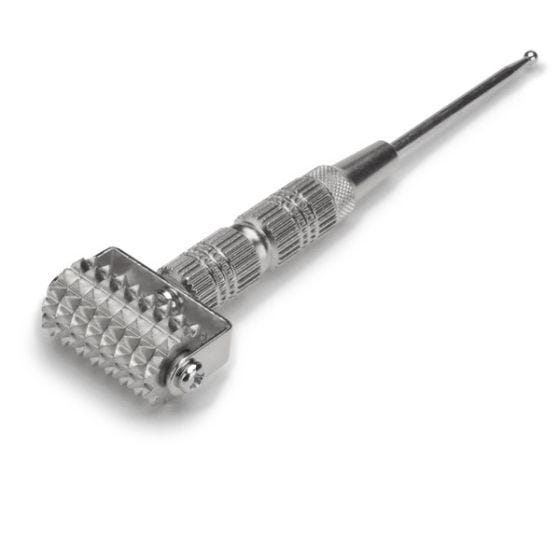 Similar in design and function to the old Tei-Shin King, but also including a 1" x 0.5" dia roller. 4.5" overall length and 0.5" dia handle with a ribbed pyramid shaped surface provides cutaneous treatment. Made of stainless steel.