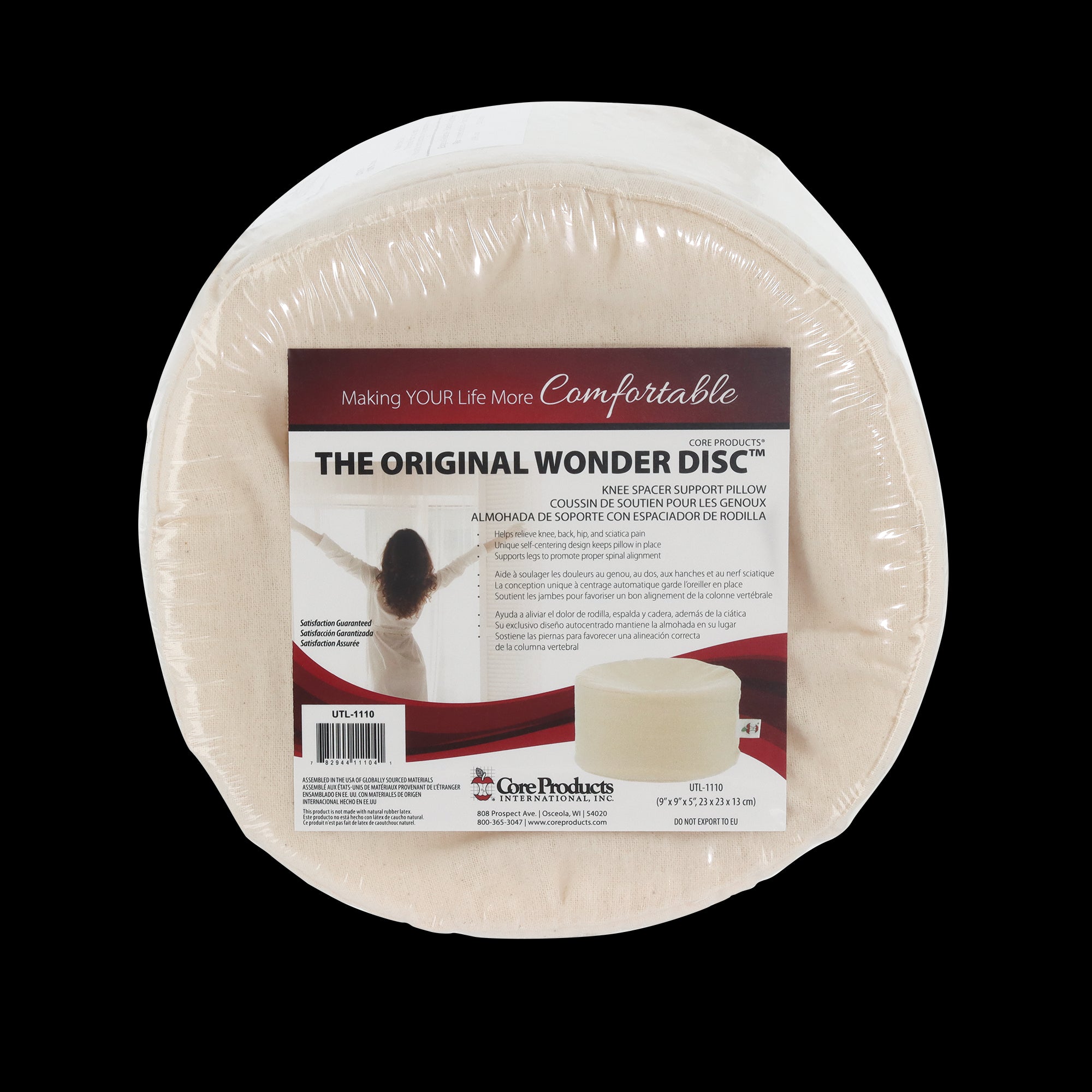 Material: Molded FoamCover: FittedColor: Natural / CreamHelps relieve knee, back, hip, and sciatica painUnique self-centering design keeps pillow in placeEncourages proper sleeping posture while pregnant The Original Wonder Disc™ positioning support pillow provides comfortable, yet firm support to help relieve pressure and strain on the lower back, hips, knees and ankles. Ideal to help relieve symptoms of sciatica pain, joint pressure, pregnancy discomfort, and improve overall healthy sleeping posture. This pillow is great for relaxing at home or travel; compact size fits conveniently in most suitcases.