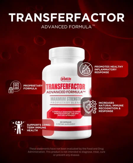 GreatLife’s Transfer Factor™ harnesses advanced natural compounds clinically shown to enhance the body’s immune system response. Transfer Factor™ collaborates with your body’s innate defenses to promote immune cell education, recognition, and activity, supporting overall wellness, resilience, and optimal health.