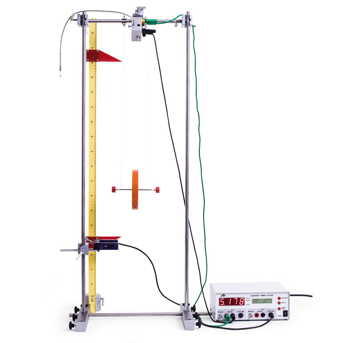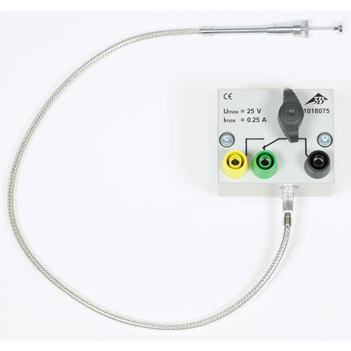 Mechanic start device for triggering a well defined start instant for Maxwell’s wheel. With 4-mm sockets for connecting to the start input of the digital counter. Triggering via Bowden cable.