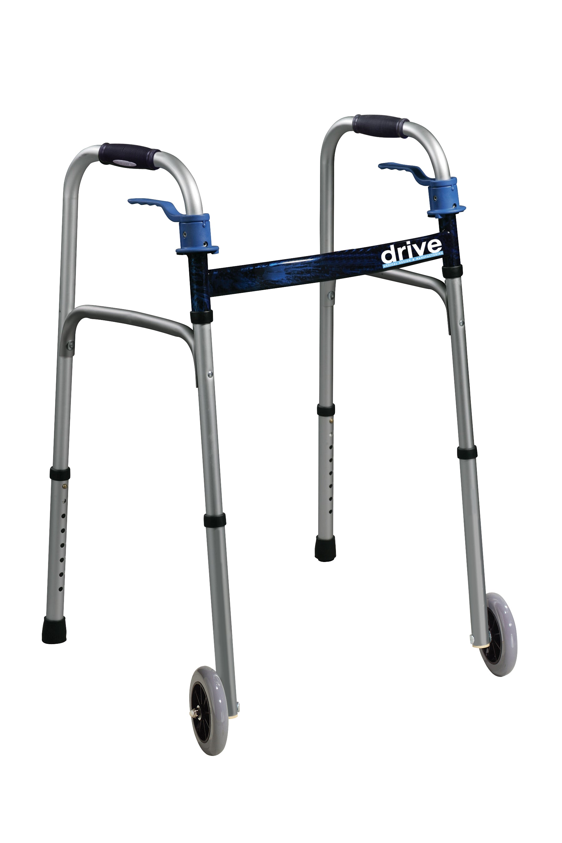 The Deluxe Trigger Release Folding Walker with 5" Wheels by Drive Medical has a trigger release feature that allows the user to close the walker without removing their hands from the handle, making it ideal for individuals with limited finger dexterity. The durable, composite trigger release can be reached with hands of all sizes and resists cracking and breaking, ensuring safety and durability. The new and improved, softer, ribbed, contoured handgrips relieve pressure on users hands. The lightweight aluminum frame ensure maximum strength and durability. Comes standard with 5" wheels, rear glide caps and glide covers providing a smooth transportation over most surfaces.