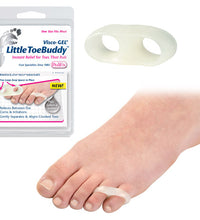 Stays in place to separate toes that rub * Aligns crooked overlapping toes * Two loops for better positioning * Relief guaranteed * Effective for weeks * Visco-GEL© ToeBuddy separates first and second toes prevents rubbing and helps maintain proper toe alignment * Soft flexible loops slip over toes to keep the spacer in place * Visco-GEL© gradually releases mineral oil to soothe soften and moisturize skin * One size fits most *